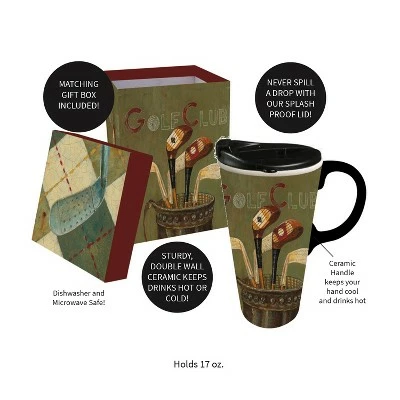 This green ceramic cup is golf-themed with the words, “Gulf Club,” and an image of clubs in a bag. The 17 oz. mug is top rack dishwasher safe and it fits in most car cup holders. It comes in a matching gift box. It has a handle and a leak-free lid.