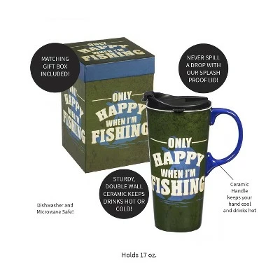 This 17 oz. ceramic travel cup comes with a flip top black lid and a matching gift box. It has a blue handle. The dark green mug reads: Only Happy When I’m Fishing. Great for Father’s Day and beyond. Microwave & dishwasher safe. At Evergreen, we are committed to producing premium, quality products to bring a touch of color and personality to your home. We respect and celebrate the uniqueness in everyone by offering one of the world’s largest selections of home and garden decor.