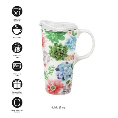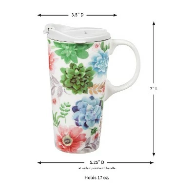 This 17 oz. ceramic travel cup comes with a flip top white lid and a matching gift box. It has a white handle. The white mug features colorful succulents in pink, blue, and green pastels with gold accent. Microwave & dishwasher safe. At Evergreen, we are committed to producing premium, quality products to bring a touch of color and personality to your home. We respect and celebrate the uniqueness in everyone by offering one of the world’s largest selections of home and garden decor.