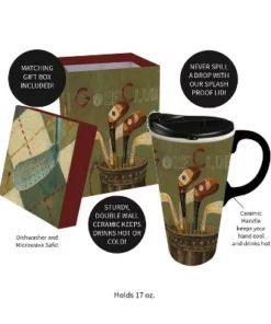 - Great to have for traveling, this mug holds up to 17 oz. of hot or cold liquid. Its circular-shaped handle helps you enjoy your morning coffee or hot tea comfortably. Fits into most vehicle cup holders. Plastic leak-resistant lid has 3 rings of silicone to help secure it inside of the cup.