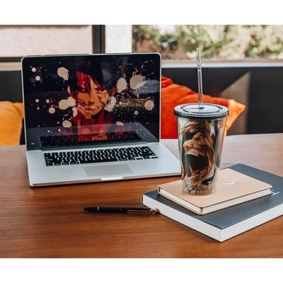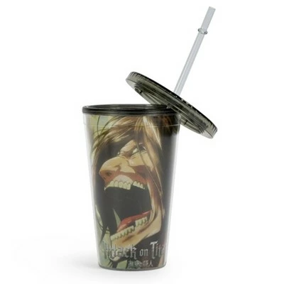 This Attack On Titan travel cup features the Erin Titan screaming and the animated show’s logo! Quality acrylic cup holds 16 ounces of your favorite beverage. Includes a straw and a twist-top for spill-resistance. Hand wash only, do not put in dishwasher or microwave. Sure to make a great gift!