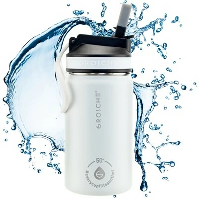 The Lil Chill by GROSCHE is a BPA free, insulated kids water bottle made with durable 18/8 stainless steel that’s built tough to handle day to day use and perfect for the playground. The Lil Chill has a double-walled vacuum insulated stainless steel body that will keep your childs beverages cold for up to 24 hours. It also has a leak proof sippy flip lid that kids can easily handle. Simply flip up the lid to drink, and flip it down to seal up the flask.These kid approved bottles are great for at home, school or on the go with the flexible silicone handle and straw. The easy-to-use sippy lid can flip open and closed to avoid messy leaks, and can be used with or without the internal straw, depending on your preference! The Lil Chill has a 12 fl. Oz capacity which is enough for your kids to stay hydrated without making it too heavy to handle or carry. The convenient size fits in most backpacks and lunch boxes easily. The fun and bright colors make these pleasing to the eye, yet classic and bold with their durable powder coated paint finish.Every time you buy a GROSCHE product you are providing 50+ days of safe water to someone in need with purchase. Each Lil Chill kids water bottle is engraved with the 50+ days of safe water emblem to affirm the change that you’ve made in someone’s life by choosing GROSCHE. You can also use this 12 fl. oz insulated stainless steel water bottle for milk, juice or any other cold beverage of choice. They are BPA and lead free, and hand washing is recommended. GROSCHE is a social enterprise and a certified Benefit corporation on a mission to help those without safe water, and funds its efforts with the sale of its coffee, tea, and hydration products. It makes a great gift idea as well – Its the gift that gives back.