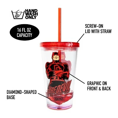IT GETS HOT IN HELL’S KITCHEN – STAY HYDRATED!Kicking butt and taking names along side this vigilante? Make sure to grab this water tumbler to take along! Load it up with 18 oz. of your favorite drink and you’re good to go! Fans of Daredevil will enjoy this retro-style comic that is plastered on the front. Enjoy quick and easy hydration all day long using the easy-to-use straw and lid combo!AN OFFICIALLY LICENSED COLLECTIBLELooking to expand your collection of Daredevil and Marvel related items? This unique water bottle would make a perfect addition to your myriad of super hero gems. This officially licensed bottle is also a great gift for friends and fans of Daredevil. Enjoy the smile that others will have as they open up this amazing tumbler!