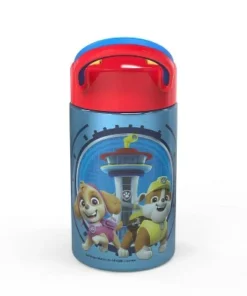 Help kids stay hydrated at the touch of a button with this PAW Patrol stainless steel water bottle! The comfortable silicone spout has a cover to keep it clean and is made with antimicrobial materials, to help prevent the spread of germs. It opens at the push of a button, but includes a built-in locking mechanism to help stop accidental spills: simply slide the locking mechanism down to block the action lid, or up to unlock before pressing the button. The 14-ounce bottle is vacuum insulated, which keeps drinks cold for up to 10 hours and prevents condensation. All the materials are durable and BPA free, and a built-in carrying handle makes travel easy, letting kids hydrate on the go.