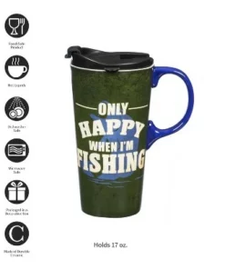 Evergreen Beautiful Only Happy When I’m Fishing Ceramic Travel Cup with Lid – 5 x 4 x 7 Inches