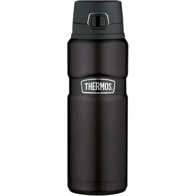 The Thermos 24 oz. Stainless King Drink Bottle is an absolute must-have for camping and outdoor enthusiasts. Its large volume is a plus and features vacuum insulation technology to keep drinks hot for up to 18 hours and cold for up to 24 hours! The smooth flow lid helps control the flow of liquids. The lid also has a push button with locking ring to help it stay leak-proof when locked closed. The exterior is sweat-proof and this bottle is top-rack dishwasher safe. Product Size (W x D x H): 3.4″ x 3.4″ x 10.4″. Please Note: The finish of these bottles (matte or glossy) may vary depending on availability.