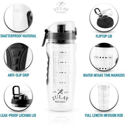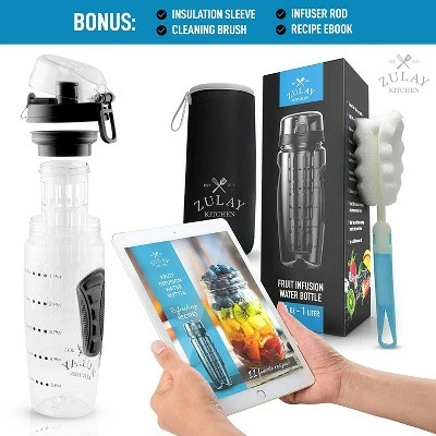 Premium leak-proof & shatter-proof design. Hydrate yourself every day with a delicious twist using our leak-proof and shatter-resistant water bottle. Built with infuser and flip-top lid that secures itself around an airtight seal, preventing any leaks. Experience the flavor of infused water with this BPA-free bottle made from top-quality Tritan that is both incredibly durable and long-lasting. Taste only the pure essences of fruity infusions with zero odors or plastic aftertaste.Shatterproof Material, Anti-Slip Grip, Leak-Proof Locking Lid, Fliptop Lid, Watter Intake Time Markers, Full Length Infusion Rod. Bonus: Insulation Sleeve, Cleaning Brush, Infuser Rod, Recipe Book. Leakproof – Silicone Seal, Fliptop Lid, Anti Slip Grip. Large 34oz Capacity – Holds More Than Most Water Bottles Available, 3.5inx9.85ozx3in.